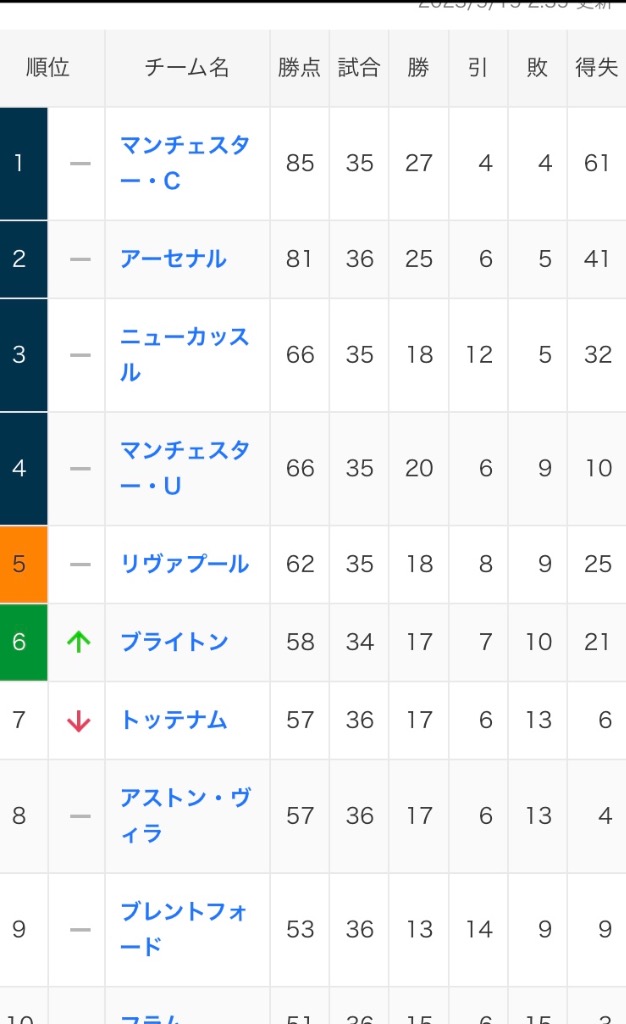 順位を見ると、1位がマンチェスターCityで勝ち点85、2位がアーセナル勝ち点81となってます!