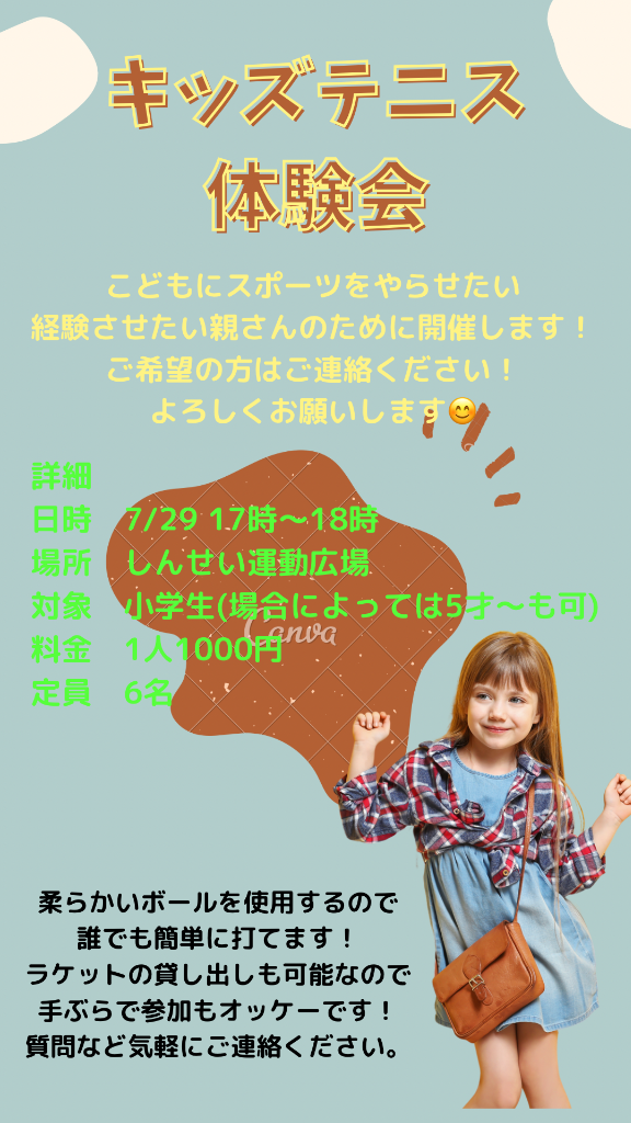 変わりまして、以前お伝えしたキッズテニスの体験会ですが、まだまだ募集中です!